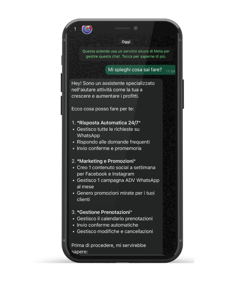 Galattico offre un assitente virtuale intelligente basato su AI generativa, che lavora instalcabilmente 24/7 per rispondere alle richieste dei clienti, gestire le prenotazioni e incrementare automaticamente le vendite. Questa soluzione avanzata trasforma il tio business attraverso chatbot personalizzati e automazioni AI, ottimizzando i processi aziendali e migliorando l’esperienza del cliente.